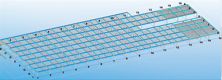 4、辅梁间支撑梁 当主梁长度低于 6m 时,主梁间需增设支撑梁,支撑梁间距 1m,主要用于楼板支撑;当主梁超过 6m(含 6m)时,辅梁之间根据设备分布视情况要增设支撑梁。