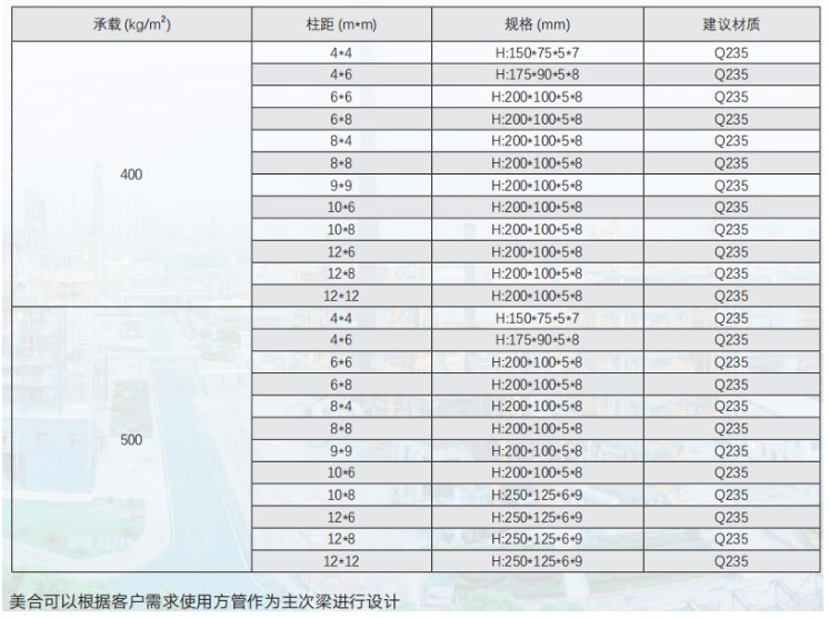 4) 不同承载及立柱间距对应的辅梁选型如下表(平台高度 5m):